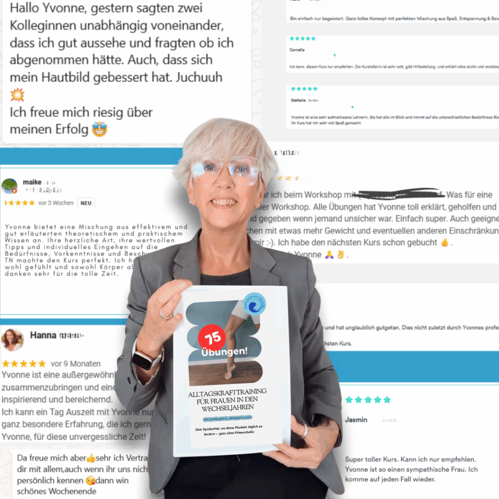 Ich bin Yvonne, Menopause-Coach, Yogalehrerin und selbst 50+. Ich kenne genau die Herausforderungen, die Frauen in dieser Lebensphase haben – aus eigener Erfahrung und aus jahrelanger Begleitung von Frauen in den Wechseljahren.
